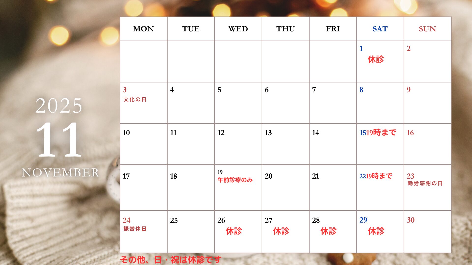 休診日:土曜午後、日曜日、祝日